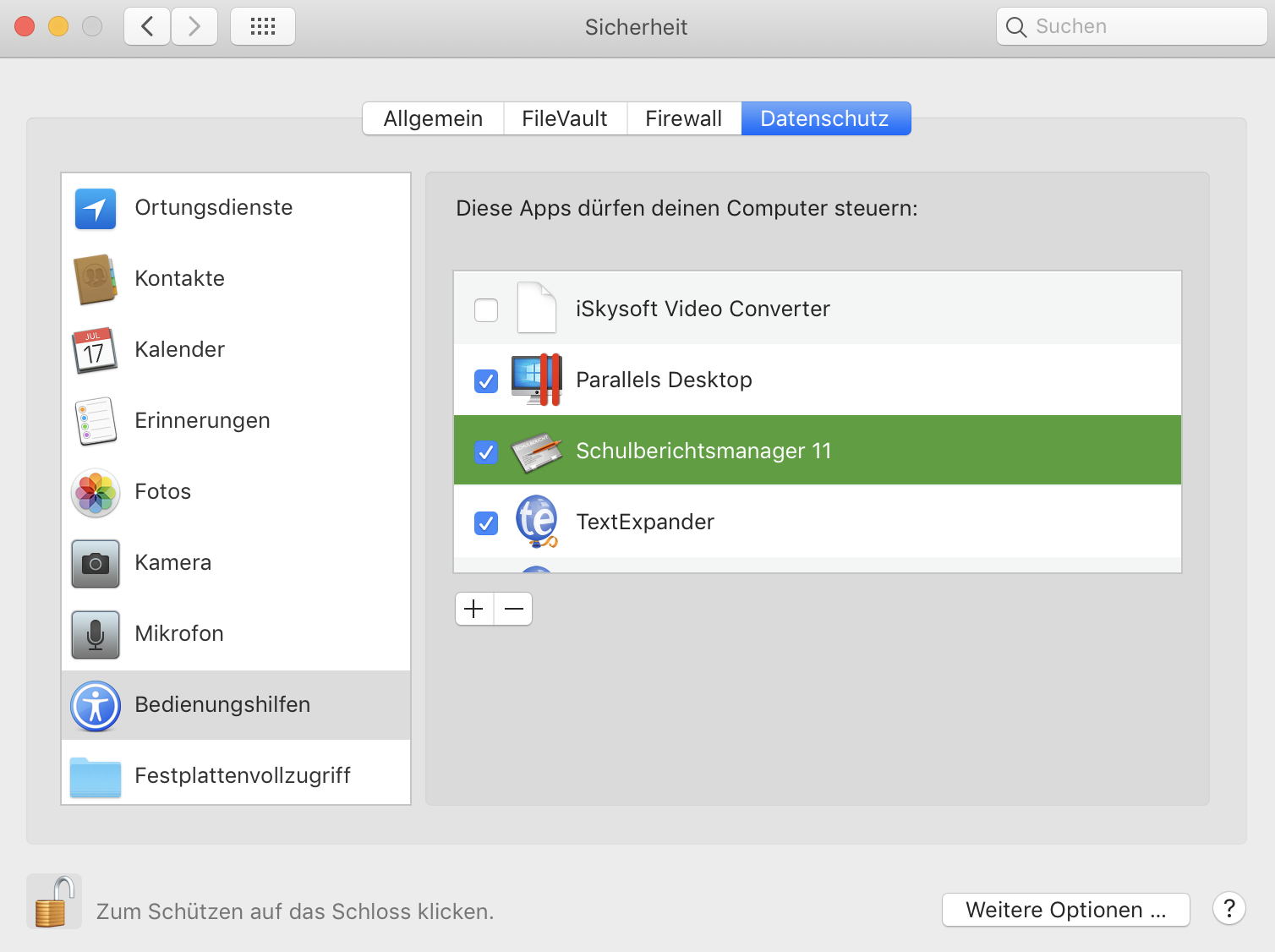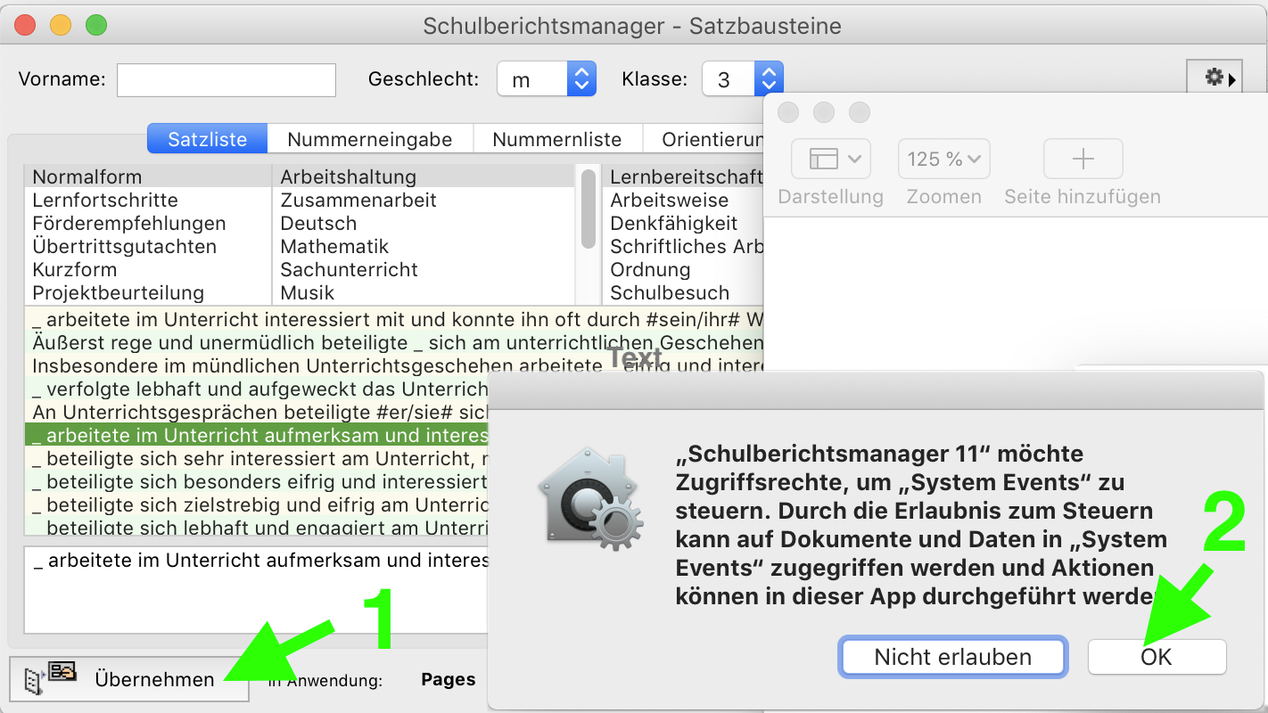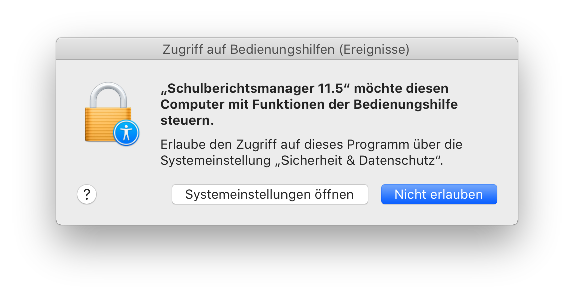 Ad-hoc Lösung: Ein einfacher Workaround ist es den »Übernehmen«-Button selbst mittels Drop in das Pages-Dokument zu "schieben" und dort "fallen" zu lassen. Drag-and-drop funktioniert ausserdem auch direkt aus der Satzliste. Ansonsten ist mit macOS 10.14 Mojave und nochmals verstärkt unter macOS 10.15 Catalina wegen der schärferen Sicherheitseinstellungen erforderlich, die Benutzung bestimmter Systemfunktionen bzw. Bedienungshilfen manuell freizugeben. Das bedeutet konkret, dass der Schulberichtsmanager bei der ersten Aktivierung des "Übernehmen"-Buttons folgende Nachfrage stellt: Ausserdem erfolgt noch eine weitere ähnlich lautende Abfrage bzgl. der Steuerung des Finders. Beide sind mit "OK" zu beantworten. Je nach Version von macOS erscheint ausserdem noch folgende Systemmeldung beim ersten Versuch der Satzübernahme: Hier wählen Sie "Systemeinstellungen öffnen". In der Systemeinstellungen muss im Bereich "Sicherheit" -> "Datenschutz" unter "Bedienungshilfen" ein Haken beim Programm "Schulberichtsmanager 11" gesetzt werden. Falls der Schulberichtsmanager in der Liste nicht auftaucht, sollte er manuell ("+") hinzugefügt werden. Ohne diese absichtsvollen Einstellungen ist es dem Schulberichtsmanager nicht möglich Daten selbstständig in ein anderes Programm zu übertragen. |