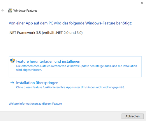 Was tun bei Fehlermeldung «Von einer App auf dem PC wird das folgende Windows-Feature benötigt: .NET Framework 3.5 ...» bei der Installation bzw. beim Start des Schulberichtsmanagers unter Windows?