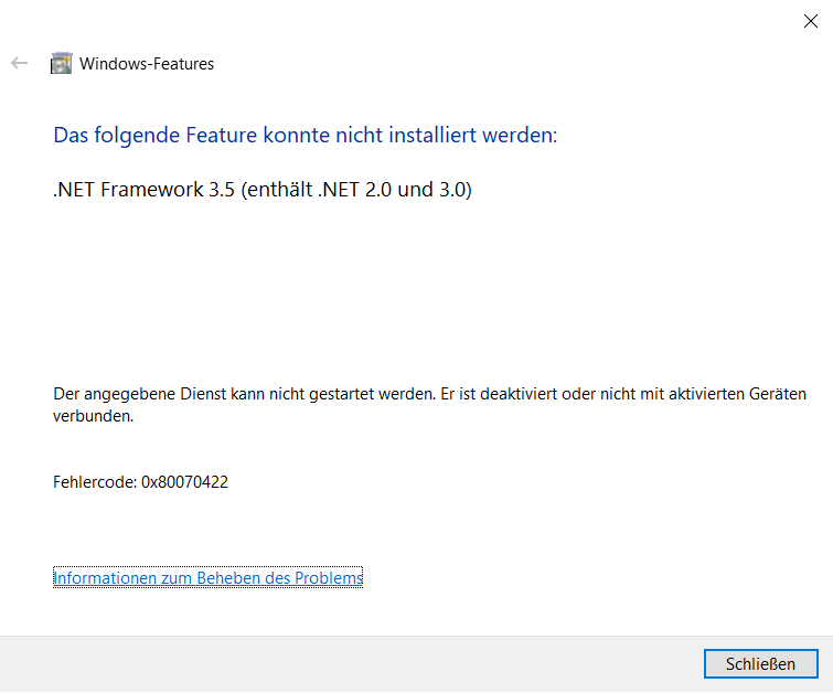 Wenn bei der Installation bzw. beim Start des Schulberichtsmanager 11 unter Windows die Meldung "Von einer App auf dem PC wird das folgende Windows-Feature benötigt: .NET Framework 3.5 ..." erscheint und nach Anklicken von "Feature herunnterladen und Installieren" die Fehlermeldung "Das folgende Feature konnte nicht installiert werden: .NET Framework 3.5 (..." eingeblendet wird, so deutet dies darauf hin, dass der Windows-Update-Dienst auf Ihrem System deaktiviert wurde. Damit ist es bei der Installation nicht möglich, eine optionale Komponente des Windows-Betriebssystems zu installieren. Bitte aktivieren Sie vor der Installation wieder den Update-Dienst! Wenn Sie dazu eine Hilfestellung benötigen, suchen Sie bitte nach dem angezeigten Fehlercode. |