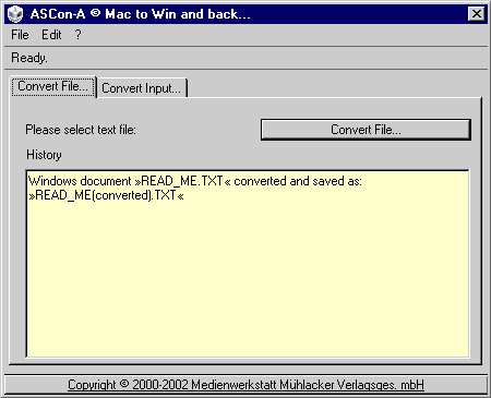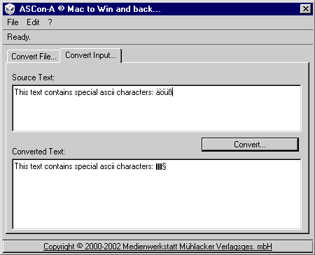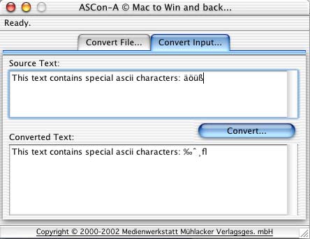 Do you want to read Windows text files on your Mac? Do you need to give your Mac text file to your Windows-using friends? ASCon-A converts text from Mac to Windows encoding and vice versa. Completely automatic and very fast!