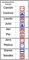 Unterrichtsorganisation mit Hilfe von Symbolen Zu Beginn eines 1. Schuljahres ist es sehr hilfreich, jedem Kind zusätzlich zu seinem Namensschild ein Symbol zuzuordnen, an dem die Kinder, die noch Schwierigkeiten haben, ihren Namen zu erkennen, sich orientieren können. Mit diesen Schildern beklebe ich alle Materialien der SchülerInnen und diese Symbole füge ich dann auch in Listen für Computerarbeit, Milchlisten und Listen zu Klassenämtern ein. Alle SchülerInnen müssen, um sich im Namensmenü der jeweiligen Klasse unter ihrem Namen einzuwählen, zunächst einmal ihren Namen auch lesen bzw. wiedererkennen kön-nen. Mit Hilfe der Symbole in der abgebildeten Liste finden die SchülerInnen ihren Namen am PC leichter wieder, zumal sie auch nur unter diesen 10 eingetragenen Namen wählen müssen; denn für eine Gruppe von jeweils 10 SchülerInnen steht ein PC zur Verfügung. Die Kinder, die bereits über recht umfangreiche Kenntnisse verfügten, setzte ich als Helfer ein (jeweils das 1. Kind in der Liste). Diese Kinder sind auch dafür verantwortlich morgens den PC einzuschalten und ihn mittags nach Schulschluss wieder herunterzufahren. Wenn die SchülerInnen eine Arbeit beginnen, malen sie den jeweiligen Kreis am rechten Rand des Wochenplans aus.