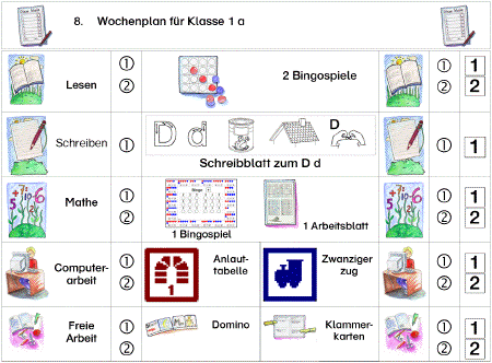 Wenn die SchülerInnen eine Arbeit beginnen, malen sie den jeweiligen Kreis am rechten Rand des Wochenplans aus. |
