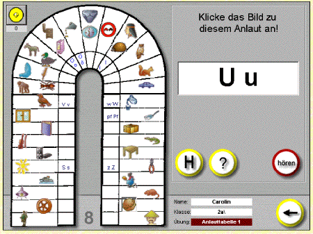 Auf der linken Seite des Arbeitsbereichs ist eine Buchstabentabelle mit Anlautbildern und den dazugehörigen Lauten bzw. Buchstaben zu sehen. Das Kind hat die Aufgabe, die vorgegebenen Laute den passenden Bildern der Anlauttabelle zuzuordnen. Indem das Kind auf den Lautsprecher-Schalter klickt, kann es einen vorgegebenen Laut erneut anhören. Wenn das Kind alle Zuordnungen geschafft hat, erhält es dafür einen Stern. |