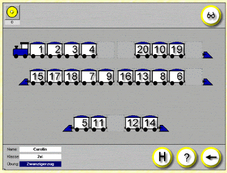 Zwanzigerzug Es erscheinen in vermischter Reihenfolge 20 Eisenbahnwagen, auf denen die Zahlen 1 bis 20 stehen. Die Wagen müssen in die richtige Reihenfolge gebracht werden. Sie werden mit gedrückt gehaltener Maustaste bewegt. Die Wagen müssen auf die beiden oberen Gleise abgestellt werden. Das unterste kleine Gleis dient lediglich zum Rangieren. Auf dem obersten Gleis müssen am Ende die Wagen 1 bis 10, auf dem unteren die Wagen 11 bis 20 stehen. |