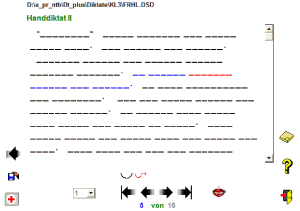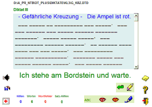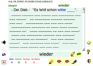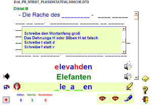 ![]() Wenn aber die Option visuelle Darbietung gewählt wird, eignet sich Diktat III wegen der Kombination der visuellen und auditiven Darbietung besonders gut für Kinder mit massiven Rechtschreibschwierigkeiten. Die Abbildung zeigt, dass die Textsequenz zusätzlich dargestellt werden kann. Wichtig: Die Übungsdaten von Diktat III können mit den Analyseprogrammen "Aus Fehlern lernen" und "Aus Fehlern lernen (pro)" nach 92 Fehlerkategorien - ähnlich dem DRT - analysiert werden. |