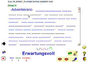 ![]() Die Abbildung zeigt: „Erwartungsvoll“ wird diktiert. Über dem Eingabefeld sind vier Hilfesymbole eingeblendet: 3 Silbenbogen und Symbol für Merkwort (M: Schreibw. voll mit v) |