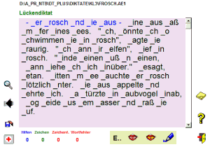 ![]() In der Abbildung ist das Diktat so vorbereitet, dass der Schüler nur die lauttreuen Wörtern schreiben muss. Durch Ausblendung der Weiterschwing-, Merk- und Ableitungswörter wurde dies erreicht. |