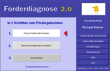 Der Autor des Buches KINDER BEOBACHTEN UND FÖRDERN (Ledl 1998) und der gleichnamigen CD-ROM (Ledl/Bettinger 1999) hat gemeinsam mit dem Sonderschullehrer und Programmierer Thomas Bettinger nach fünfjähriger Forschungs- und Entwicklungsarbeit das Computerprogramm FÖRDERDIAGNOSE herausgegeben, das für Grund- und Sonderschullehrer sowie für verwandte Berufsgruppen (Kindergärtner, Erzieher, Schulpsychologen, Therapeuten u.a.) eine wertvolle Hilfe im Sinne einer interdisziplinären Kooperation darstellt.