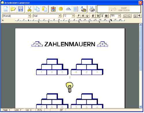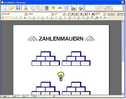 Der Arbeitsblatt-Generator der Lernwerkstatt 7 wurde komplett neu entwickelt. Seine Oberfläche entspricht jetzt denen professioneller Textverarbeitungen wie Word, bietet aber insbesondere für die Erstellung von Arbeitsblättern zahlreiche nützliche Funktionen. So können nicht nur wie bisher Bildschirminhalte der Lernwerkstatt fotografiert, sondern auch schulbezogene Icons und Übungs-Blankovorlagen in das Arbeitsblatt eingebunden werden. Eine völlig freie Positionierung der Bilder sowie die Integration von Tabellen sind leicht möglich.