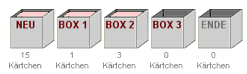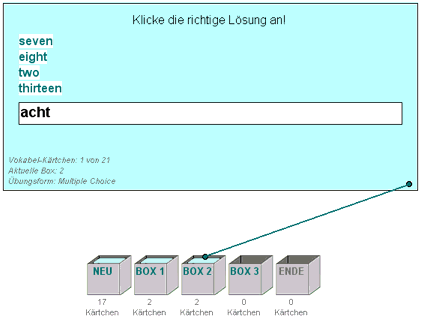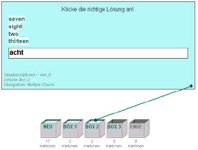 Das Üben der Lernwörter ist komplett überarbeitet worden. Gearbeitet wird jetzt nach dem Karteikärtchen-Prinzip. Hierbei wandern die Lernwortkärtchen nach richtiger Bearbeitung schrittweise von Box zu Box weiter, bis sie in der letzten Box landen und dort als gesichert angesehen werden. Fehlerhafte Bearbeitung lässt die Kärtchen wieder zurückwandern.