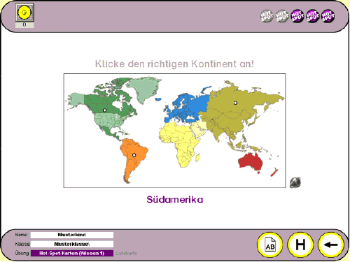 Die folgende Hot-Spot-Karte zeigt exemplarisch am Beispiel eines Bildes zu den Kontinenten der Erde die Funktionsweise. Das Kind soll auf den Hot Spot „Südamerika“ klicken und hat dafür die Auswahl zwischen insgesamt drei Hot Spots. Wenn das Kind den richtigen Hot Spot anklickt, erhält es dafür einen von fünf Hot-Spot-Punkten (rechts oben im Bild). Klickt das Kind einen falschen Hot Spot an, wird der Punkt wieder abgezogen. Sobald das Kind alle fünf Hot-Spot-Punkte gesammelt hat, wird dafür der Stern (links oben im Bild) auf dem Konto des Kindes gut geschrieben.