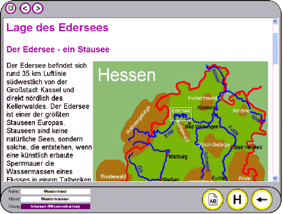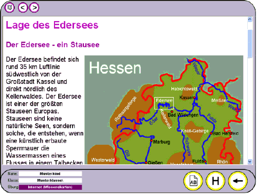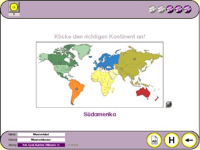 Über das kleine Weltkugelsymbol (im Beispiel rechts unten neben der Weltkarte) kann das übende Kind eine Hilfe in Form einer Wissenskarte aufrufen, sofern der Rechner über eine Internetverbindung verfügt. Hot-Spot-Übungen können von jeder Lehrkraft zu jedem beliebigen Fach (Thema) im Lehrkraftmodus der Lernwerkstatt 7 auf einfache Weise selbst angelegt werden. Sie benötigen zu der von Ihnen gewünschten Übung lediglich ein Bild bzw. eine Grafik mit dem zu übenden Inhalt.