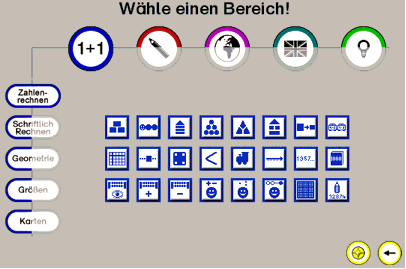 Aufgrund der Vielzahl der Übungen, die die Lernwerkstatt zur Verfügung stellt, wurde zur besseren Übersicht eine Einteilung der Übungen in Übungsbereiche vorgenommen. Damit hat sich auch die Navigation im Hauptmenü für die Kinder verändert. Im oberen horizontalen Menüteil ist nun das Fach auszuwählen, im linken vertikalen der jeweilige Übungsbereich. Das folgende Beispiel zeigt diejenigen Übungen an, die im Fach „Mathematik“ (Bereich „Zahlenrechnen“) zur Verfügung stehen.