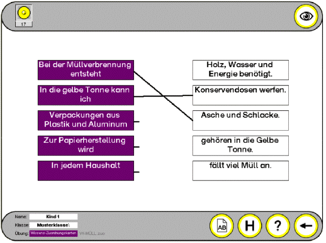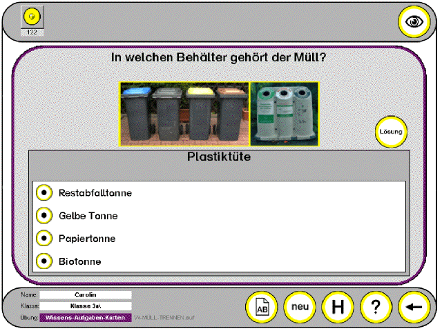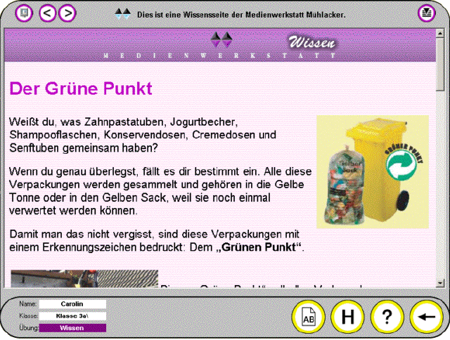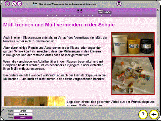 Auf den Wissensseiten zum Thema Müll können sich die SchülerInnen mit Hilfe von Texten, Grafiken und Fotos gezielt Informationen zu den unterschiedlichen Aspekten des Themas - Müllproblematik, Umwelterziehung, Mülltrennung, Müllsortierung, Müllvermeidung und Recycling verschaffen. Auch Handlungsanregungen zur Verhaltensänderung und zum verantwortlichen Handeln am Beispiel der praktischen Arbeit einer Schulklasse an diesem Projekt fließen in die Thematik ein. |