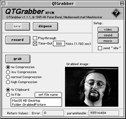 QTGrabber ("new") Using "New" returns a value (referred to as the "paramHandle") used in many of the following calls. QTGrabber ("setup", paramHandle, mediaType ) where paramHandle is the parameter handle returned by "new" and mediaType is any of these options: "video", "sound", or "music" QTGrabber ("record", paramHandle, pathName, playThruDuringRecord) where paramHandle is the parameter handle returned by "new", pathName is any valid Mac path name, and playThruDuringRecord is either "true" or "false". QTGrabber ("grab", paramHandle, pathName, compression) where paramHandle is the parameter handle returned by "new", pathName QTGrabber ("update", paramHandle) where paramHandle is the parameter handle returned by "new". QTGrabber ("idle", paramHandle) By now you probalby get the idea with paramHandle. QTGrabber ("dispose", paramHandle) |