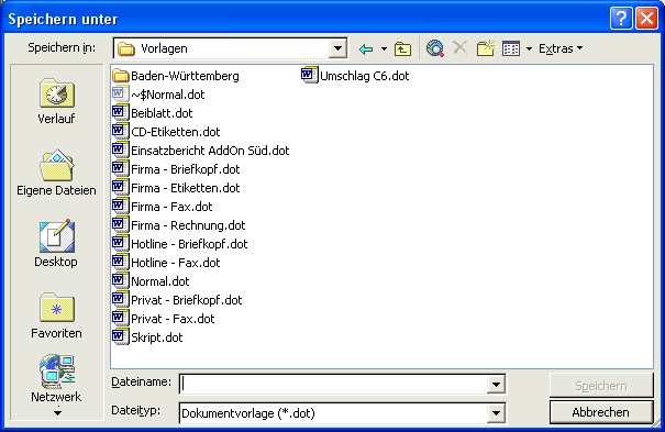 Nach einem Klick auf die Schaltfläche "Speichern" steht das neue Zeugnisformular dann wie gewohnt auf dem Fenster "Neu" bereit, das Sie über den Menübefehl "Datei/Neu" erreichen. Hinweis: Wenn Sie das nächste Mal ein vorhandenes Dokument öffnen wollen, werden diese eventuell im Öffnen-Fenster nicht angezeigt. Stellen Sie dann sicher, dass im Rollfeld "Dateityp" der Eintrag "Alle Word-Dokumente" oder "Alle Dateien" eingestellt ist. © 1996-2010 Medienwerkstatt Mühlacker Verlagsgesellschaft mbH |