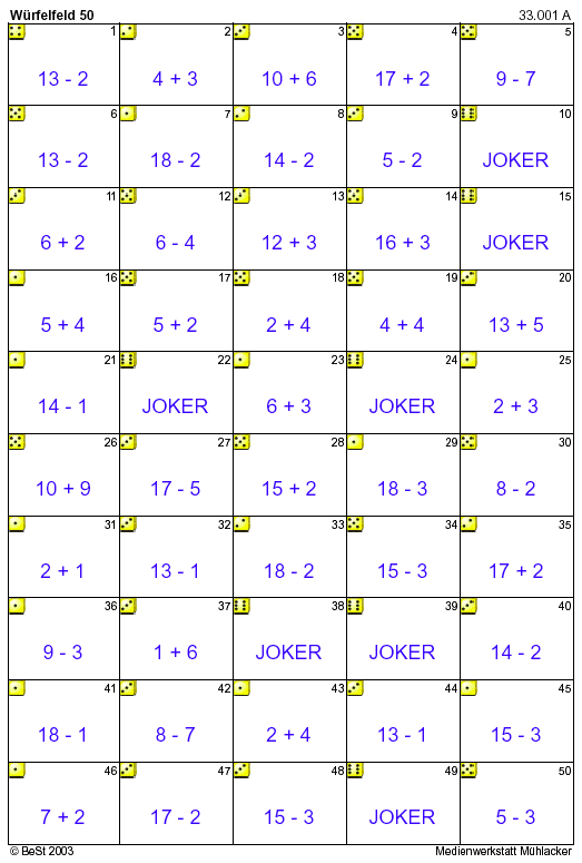 Jede Spielart bietet zu mehr als 50 Unterrichtseinheiten (mit verschiedenen Zahlenräumen und Rechenarten) Spielvorlagenblätter zum Ausdrucken. Viele Spielvorlagen gibt es darüber hinaus in mehreren Varianten mit unterschiedlichen Aufgaben. Zu den meisten Spielen gibt es Lösungsblätter zur Kontrolle während des Spielens. Oft wird es aber genügen, wenn die SpielerInnen sich selbst gegenseitig kontrollieren.