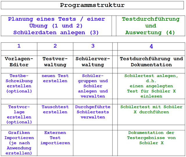 Voraussetzung für die Durchführung eines Tests / einer Übung ist, dass ein Test / eine Übung angelegt wurde (1 und 2). Testbeschreibung und Testvorlage (1) sind optional. Die Schülerdaten (3) müssen angelegt sein (Klasse, Name). Bei der Testdurchführung (4) wird als erstes der Schüler angewählt. Danach muss der jeweilige Test / die Übung eingelesen werden. Im nächsten Schritt wird der Test / die Übung durchgeführt. Jetzt kann der Test ausgewertet werden (4).