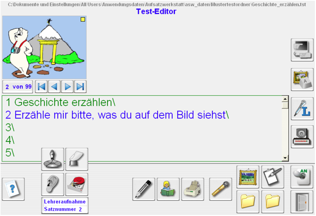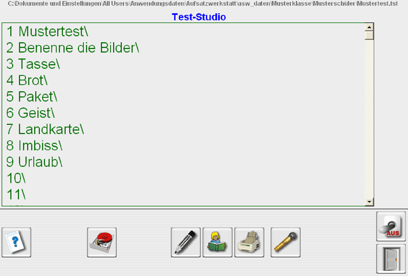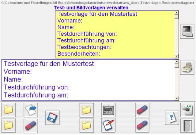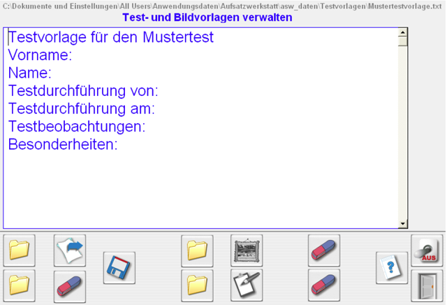 Mit dem Button 5 (Diskette) werden Vorlagentexte und Testbe-schreibungen automatisch im Unterverzeichnis Testvorlagen abgespeichert. Mit den Buttons 6 (Ordner) und 7 (Ordner) können eigene sowie externe Bildvorlagen geladen werden. Mit den Buttons 8 (Bild) und 9 (Notizblock) können Bildvorlagen und Textvorlagen ein- und ausgeblendet werden. Mit den Buttons 9 (Radiergummi) und 10 (Radiergummi) können Bildvorlagen und Testvorlagen gelöscht werden.