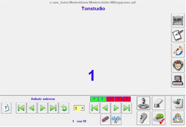 Mit dem L-Mikrofon-Button (rechter Rand Abb. 16) wird das Tonstudio geöffnet. Durch einen Klick mit der rechten Maustaste auf den aufzunehmenden Satz im Textfeld erscheint die Satznummer im Lehreraufnahmestudio und der Satz wird blau eingefärbt. Jetzt kann die Sprachaufnahme durchgeführt werden.