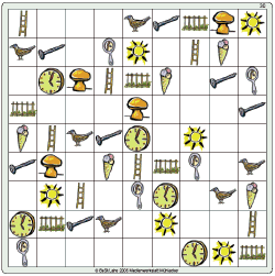 Sudoku wird auf einem 9x9 Felder großen Spielfeld gespielt. Dieses ist in 3x3 "Unterquadrate" aufgeteilt. Am Anfang des Spiels sind in einigen Feldern schon Bilder (Symbole, oder Ziffern) eingetragen. Das Ziel des Spieles besteht darin, das Spielfeld so zu vervollständigen, dass jedes Bild (Symbol oder Ziffer) genau einmal in jeder Zeile, jeder Spalte und jedem Unterquadrat auftritt. |
